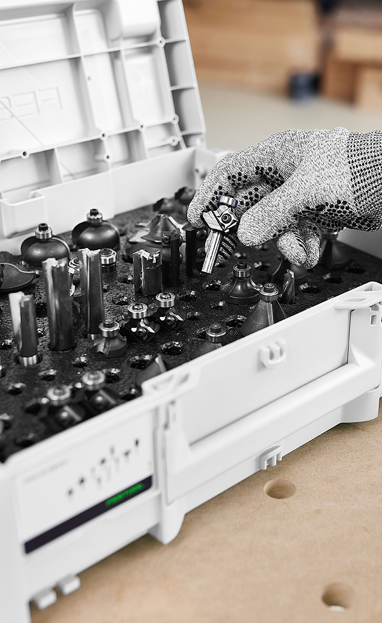 Toate maşinile de frezat sunt depozitate perfect, sunt protejate optim şi sunt întotdeauna la îndemână. În cutia de biţi pentru maşina de frezat muchii/profiluri sau în organizatorul Systainer³ practic, cu compartimente pentru sculele de frezare.